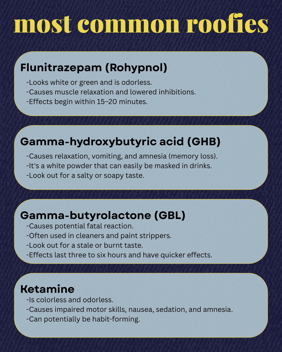 Gamma-hydroxybutyric acid (GHB) is another common roofie, and like Rohypnol, it can cause relaxation, vomiting, and amnesia (memory loss). GHB is a white powder that can easily be masked in drinks. However, it often has a salty or soapy taste, so there's something to look out for.